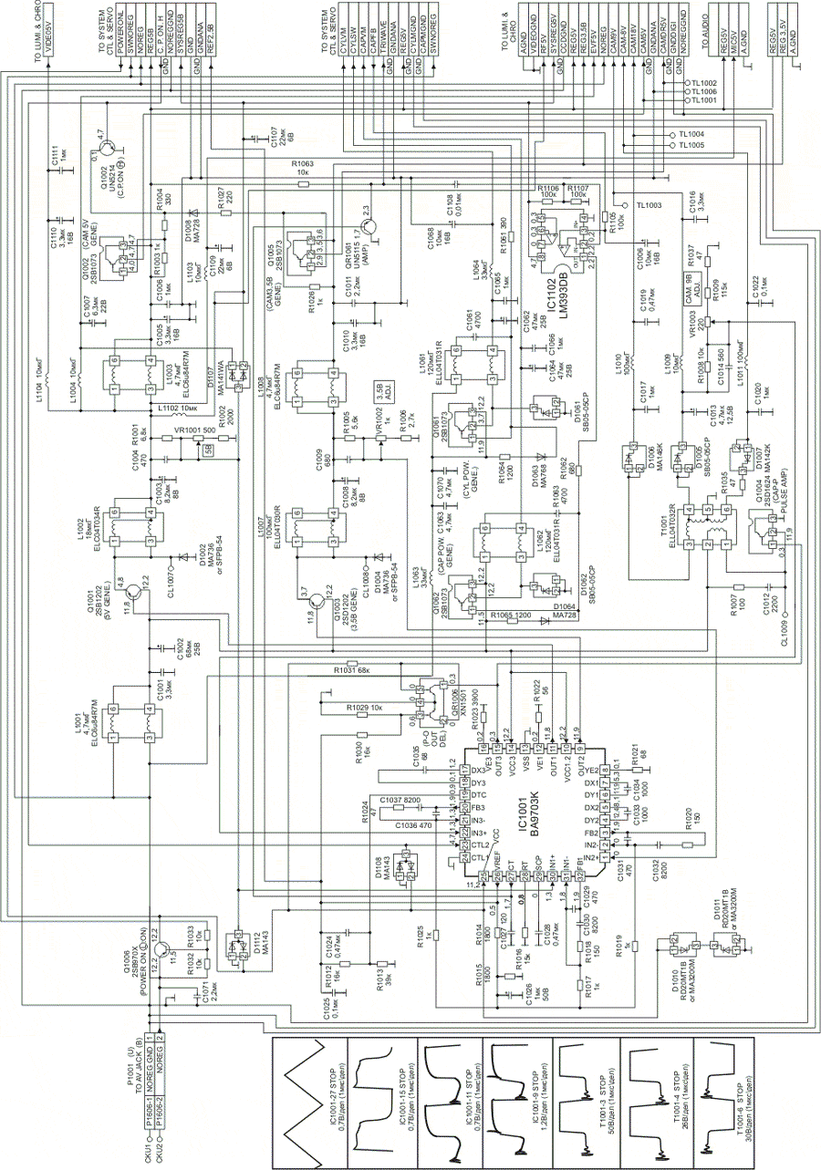 Второй канал формирует выходной ШИМ сигнал на выв. 9 IC1001, а сигнал ООС поступает на выв. 1 микросхемы. Он управляет ключевой схемой на элементах Q1003, D1004. На выходе схемы формируется напряжение +3,5 В (регулируется в небольших пределах подстроечным резистором VR1002). Выходное напряжение +3,5 В по цепи REG3,5V поступает на каналы изображения и звука постоянно. Это же напряжение цепи САМ3,5V проходит на камерную часть видеокамеры через ключ на транзисторе Q1005, управляемый сигналом C.P.ON.H через ключ на транзисторе QR1002.