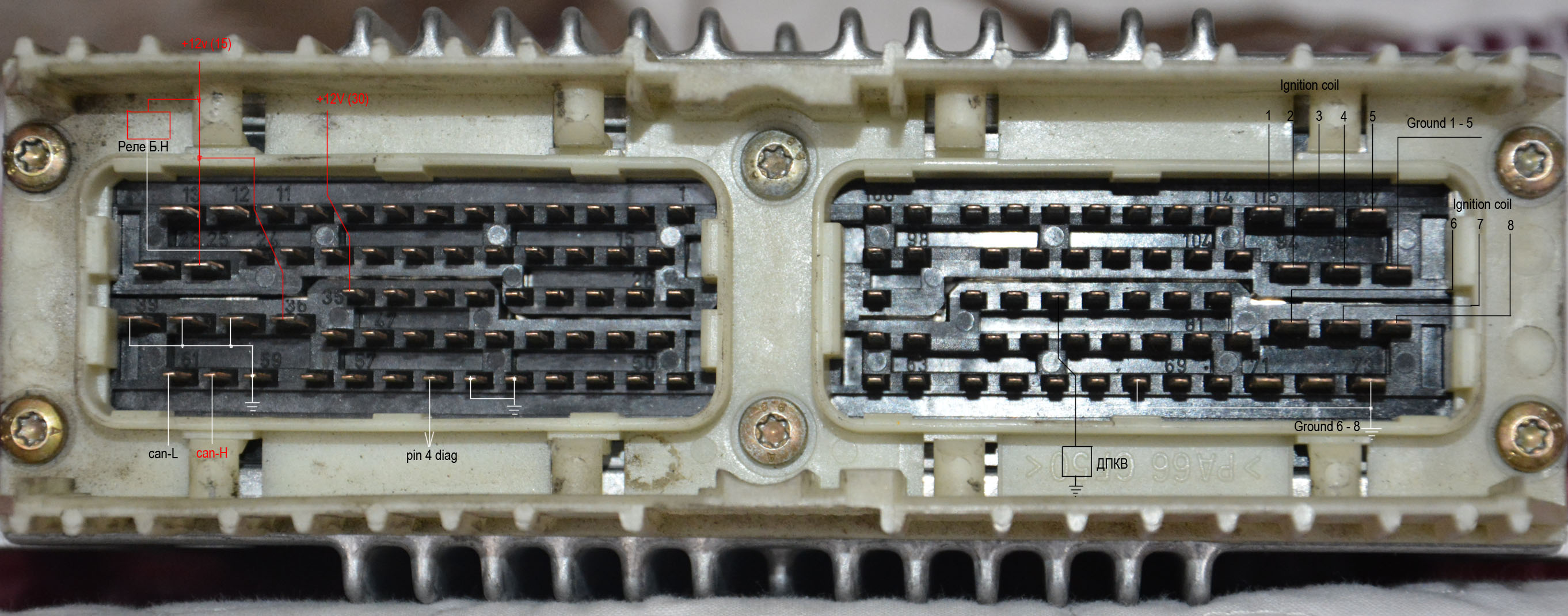 4 Секция - 11 = главное реле. 12 = реле бензонасоса. 24 = от замка зажигания IGN. 8-28 = Диагностика