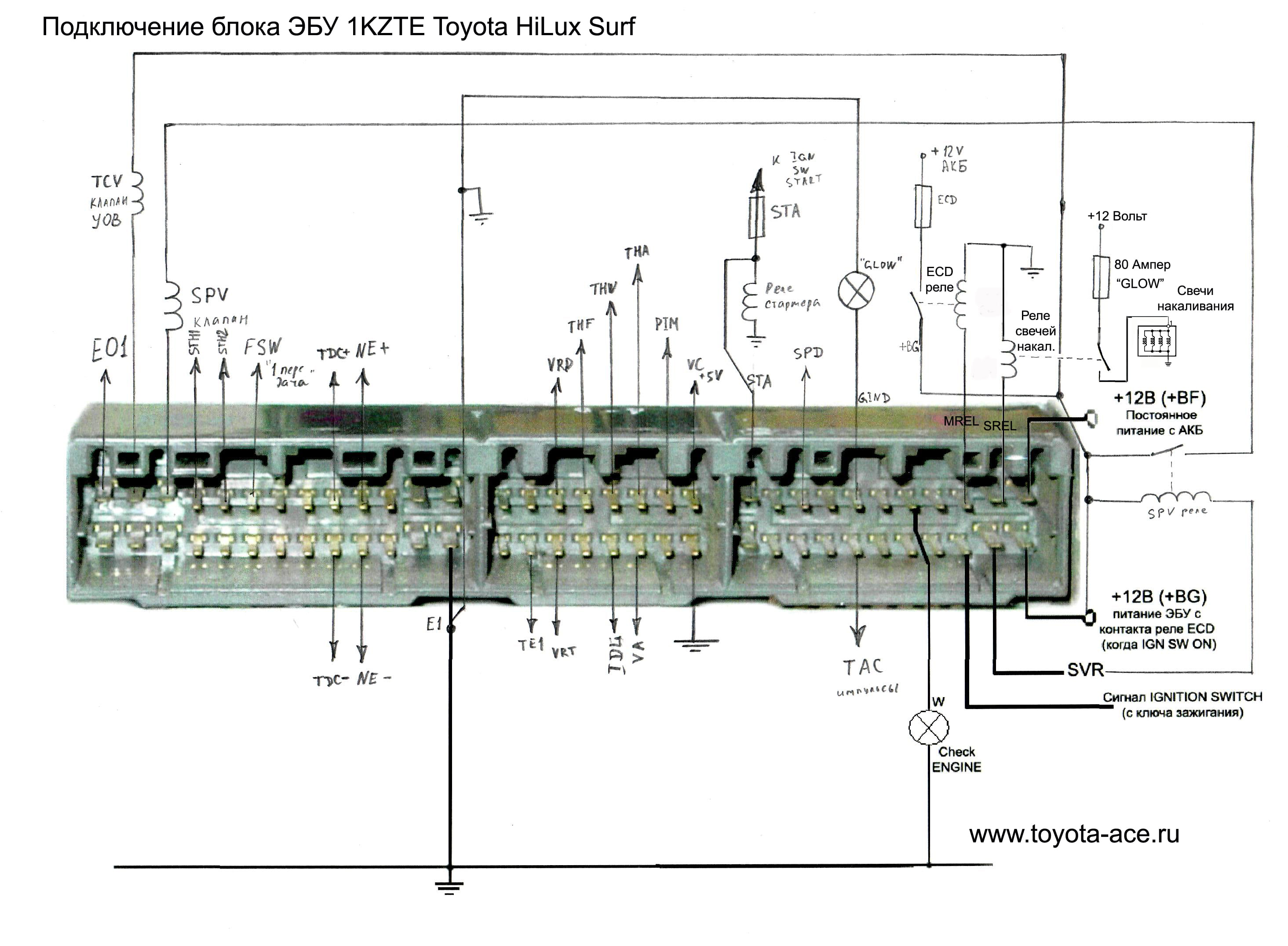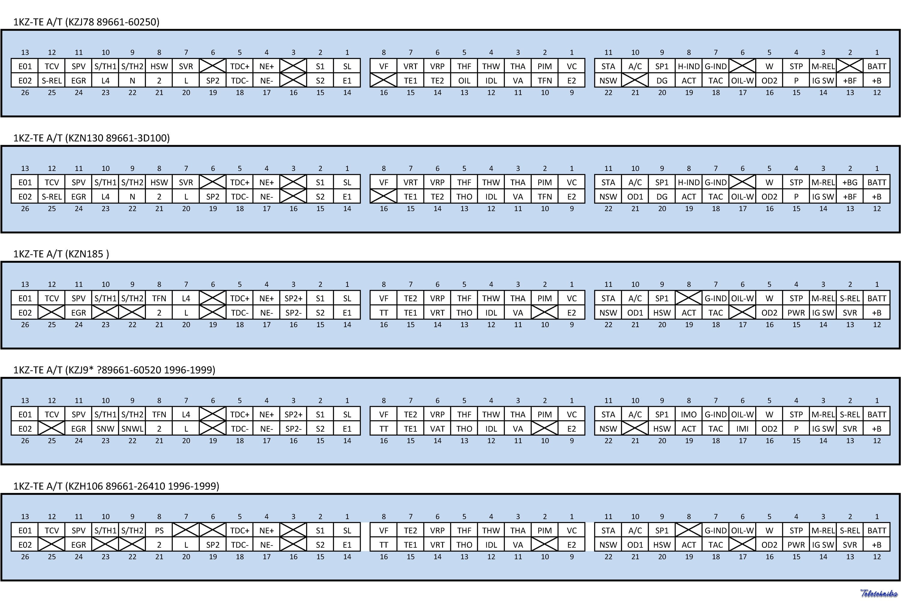 В связи с частыми выходами из строя штатного контроллера двигателя на 1KZ-TE (89661-60250) решил собрать в одном месте все распиновки ECT, которые смог найти и проверить. Проверять старался очень тщательно, но 100% гарантию не дам, т.к. многообразие контроллеров на 1KZ-TE впечатляет.